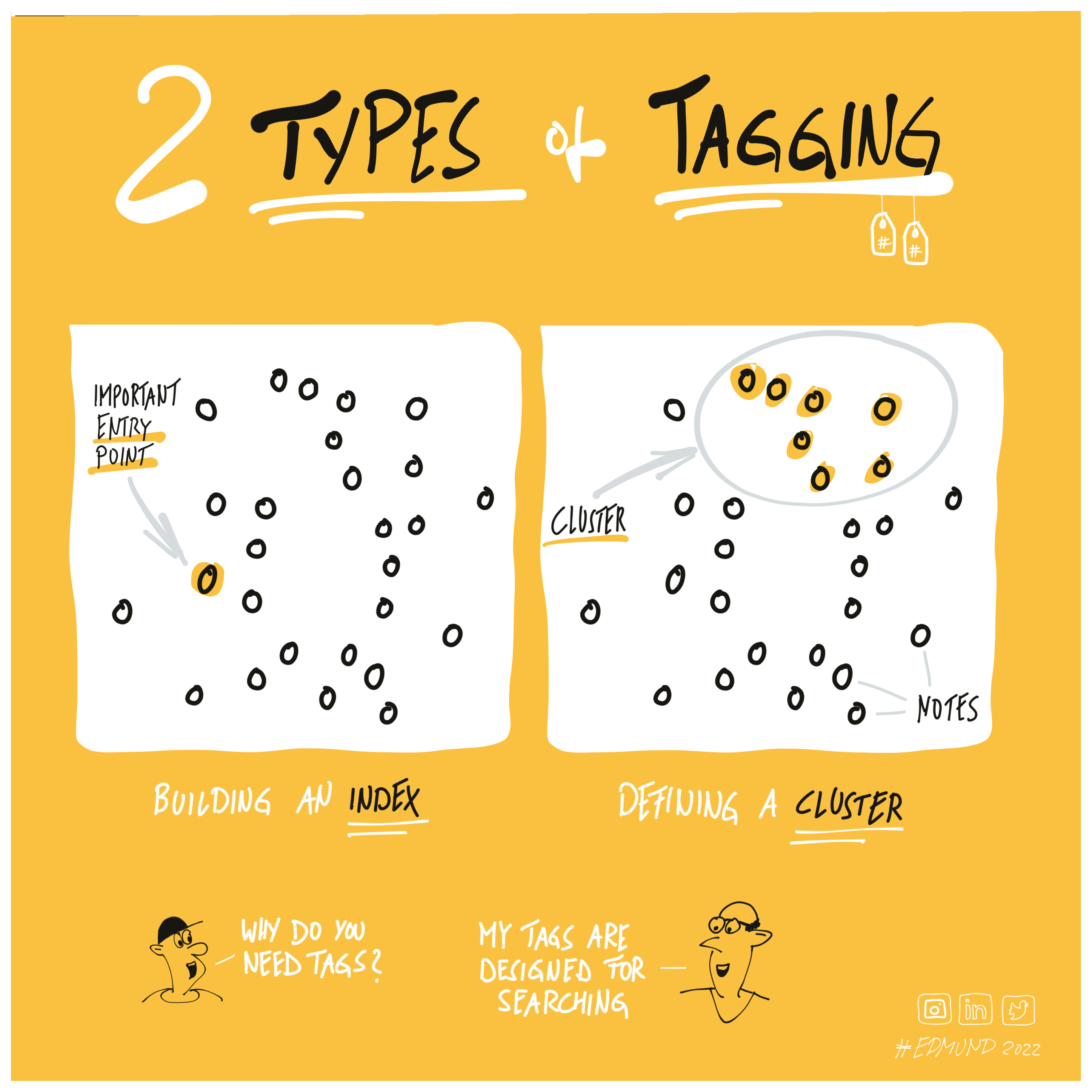 While tags for indexing should link only a few important notes, the entry points for further investigation, the tags for clustering connect larger groups of notes with similar focus.